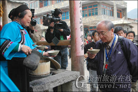 出了演武堂,日本客人对屯堡的特产产生了浓厚的兴趣。戴上一只面具,提着一壶米酒,他们站在店铺里,任由记者拍照,脸上全是灿烂的笑容。